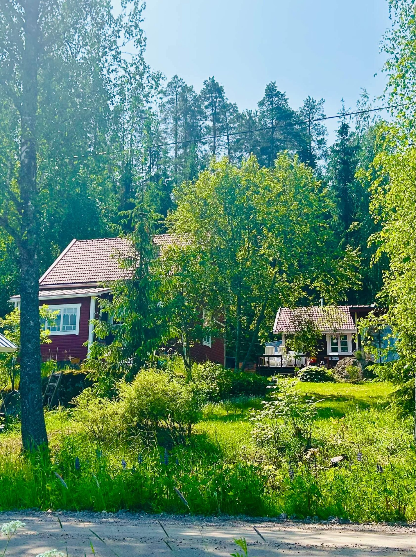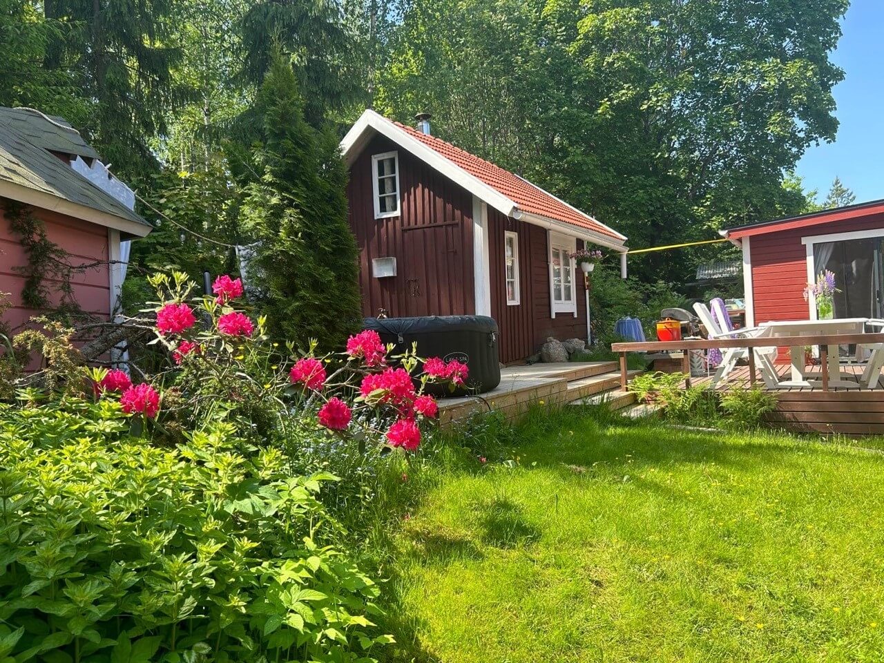 Valonkielen saunamökki ja kukkiva puutarha Artjärvellä.